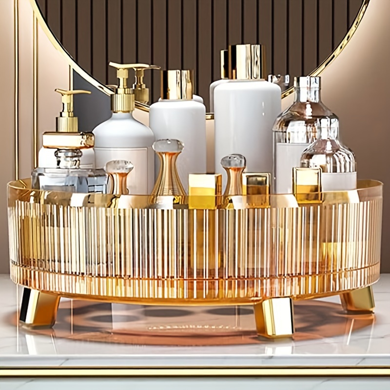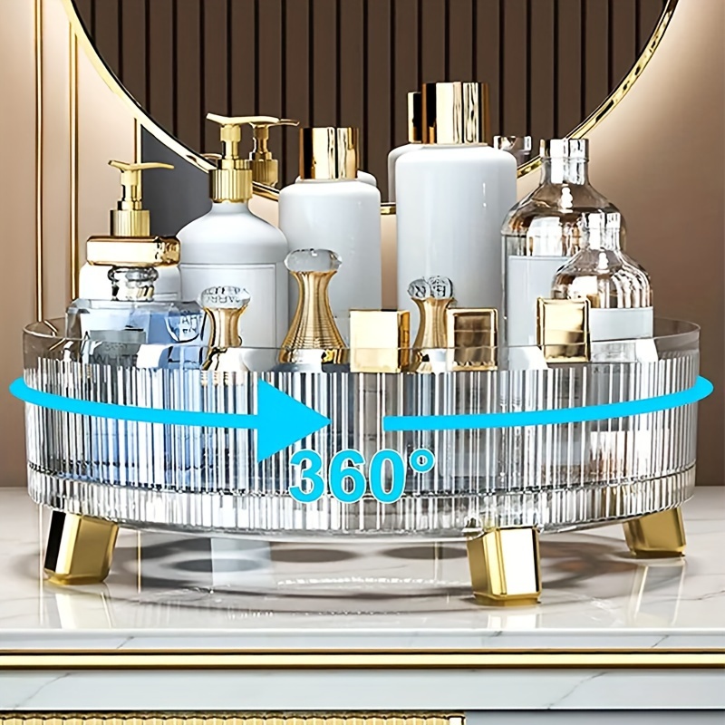 Elevate your space with the 360-degree Rotating Makeup and Perfume Organizer. Crafted from durable, thickened PET, this organizer promises longevity without fading or odors. Its elegant vertical grain design and rounded corners effortlessly blend with any decor. Featuring smooth, stainless steel ball bearings, it rotates seamlessly, maximizing storage efficiency even in hard-to-reach corners. With a generous 11-inch diameter, it offers ample space for lipsticks, foundations, and more, turning chaos into order. Perfect for bathrooms, vanities, kitchens, and counters, this versatile organizer keeps your essentials tidy and within reach. Enjoy a polished, organized lifestyle with this stylish and practical addition to your home.