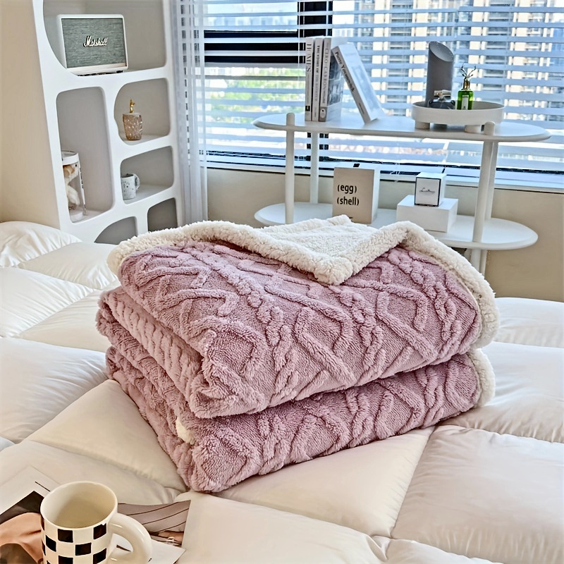 Introducing our Luxurious Doublesided Lamb Wool Taffeta Blanket! Exquisitely crafted from 100% Polyester, this blanket features a unique vintage style, perfect for adding a touch of elegance to your living room or bedroom. The rich purple hue coupled with a small fresh pattern provides a charming aesthetic appeal. With its double-sided lamb wool taffeta design, it offers an exquisite blend of comfort and warmth, making it an ideal companion for those chilly winter nights. This multipurpose blanket is machine-washable, making it easy to maintain its fresh and fluffy texture. Moreover, its knitting weaving method adds an extra layer of durability, ensuring it retains its plush feel for years to come. Whether you’re curling up for a nap on your sofa or adding an extra layer of warmth to your bed, this blanket delivers unrivaled coziness. Experience the joy of snuggling into this warm and cozy blanket today!